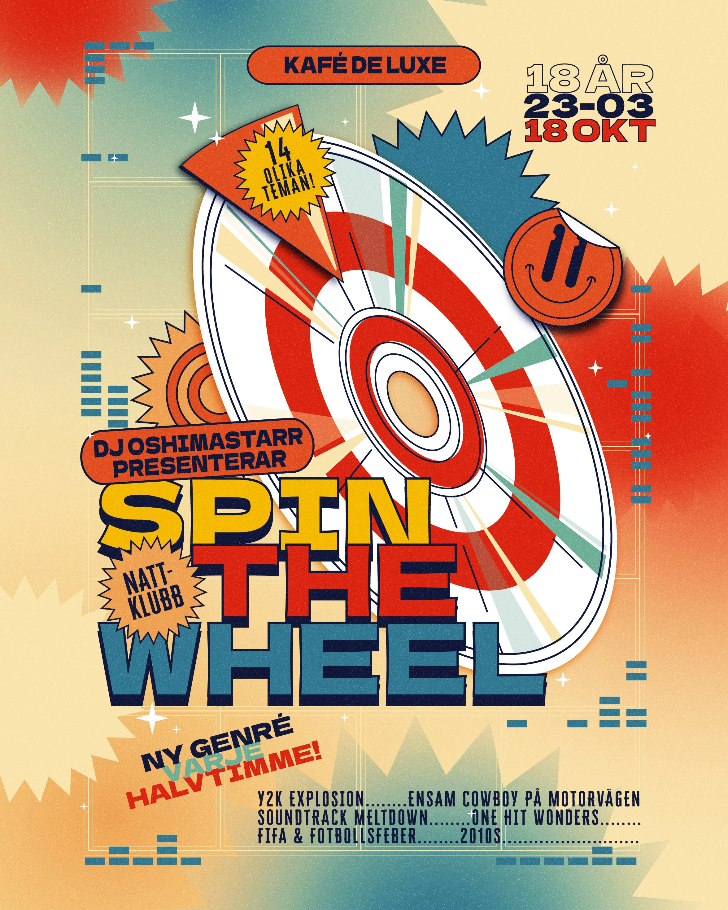 Varmt välkomna ner på Spin The Wheel-klubb nere i gillestugan denna förträffliga lördag. Ett nytt koncept för en publik som hungrar efter det fräschaste. Oshimastarr spelar natten lång, och han har i veckorna fixat ett färgglatt lyckohjul. På detta lyckohjul finns det 14 olika teman av varierande familjär känsla. Detta hjul kommer varje halvtimme att snurras för att hålla dansgolvet på tårna med nya teman natten lång. Några teman som kommer bjudas på är:
