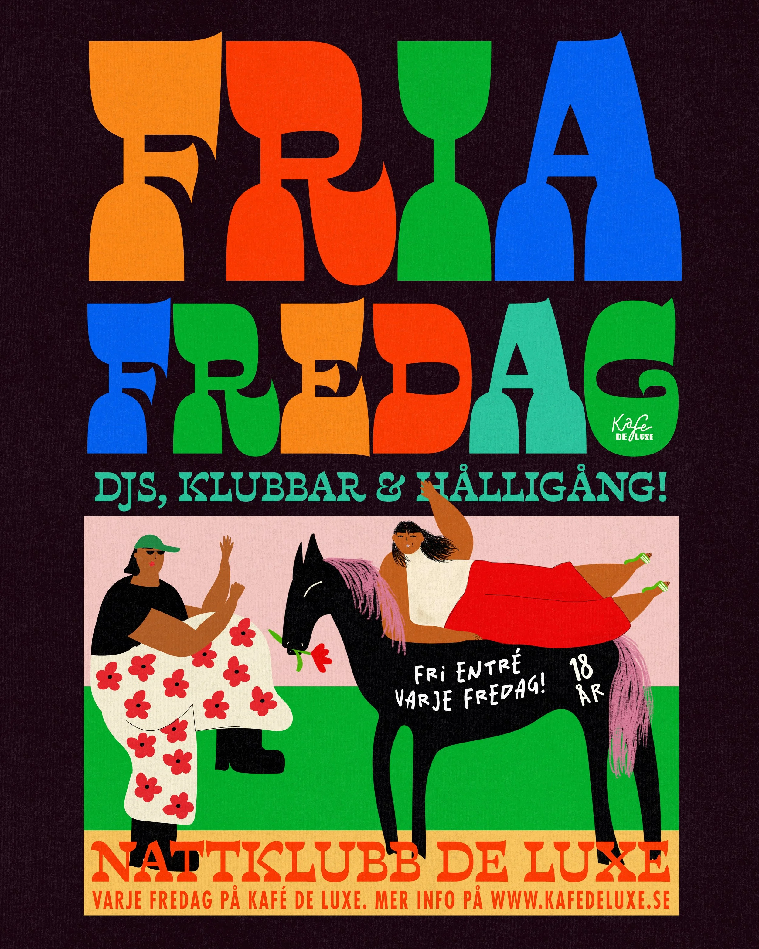 Fria Fredag! Varje fredag kan du dansa, mingla och slå runt på dansgolvet helt utan att betala för det! Vi bokar in DJs, ni beställer något i baren och sen möter vi natten gemensamt med allsång och händerna i luften!