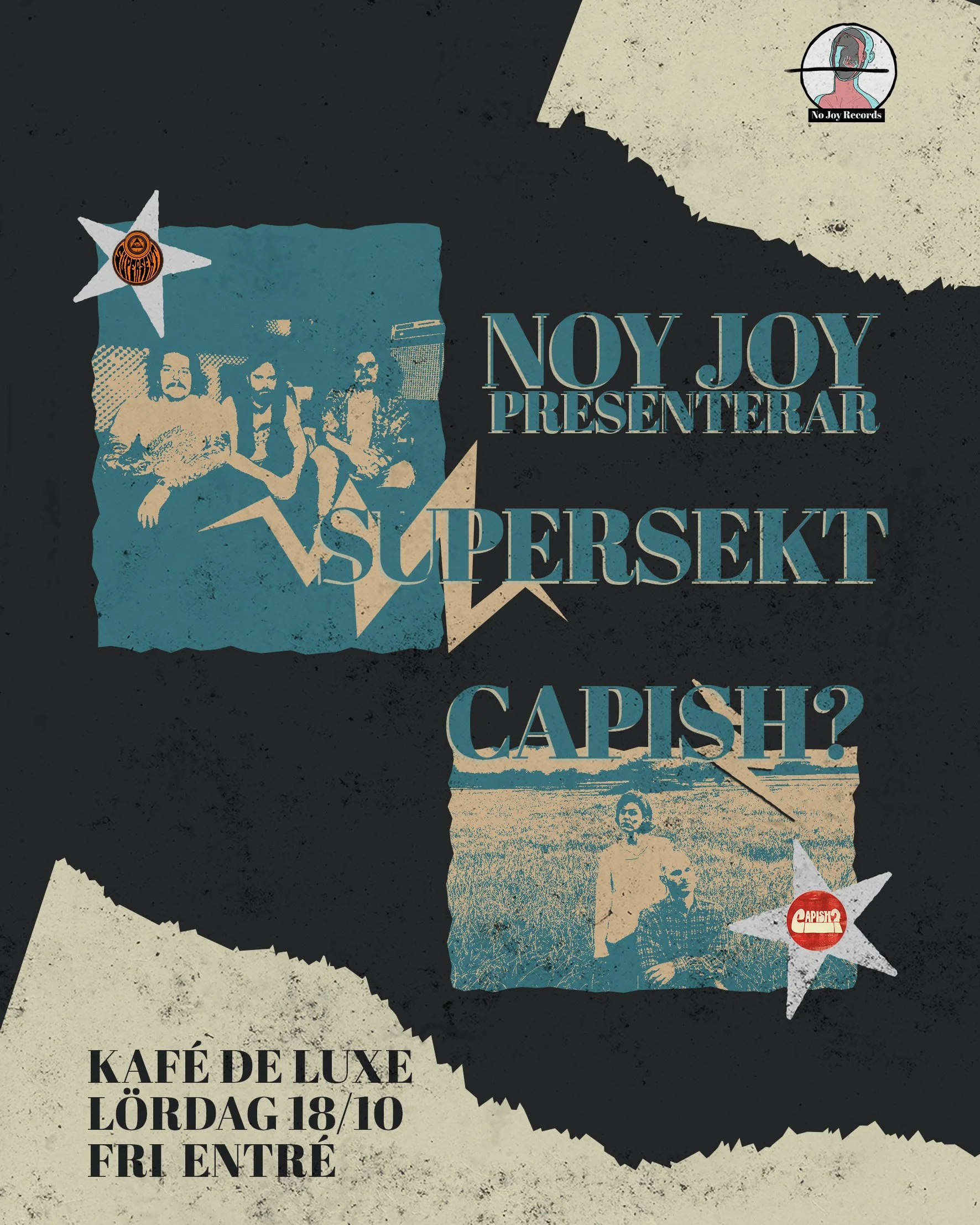 No Joy records bjuder in till ännu en mysig kväll där vi får se den lokala musikscenen briljeja, denna gång med hejdundrande releasefest för Supersekt! Dessutom med fina Capish! som support, och vet ni vad, No Joy bjuder på detta! Gratis inträde! Joy!